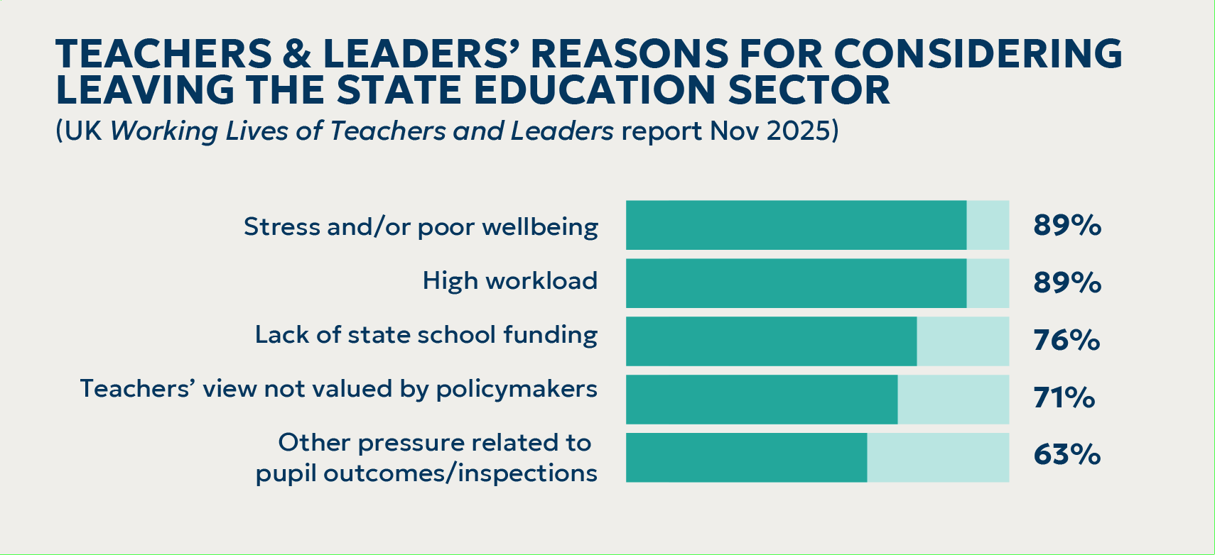 A few months later, the UK's Working Lives of Teachers and Leaders report found that 29% of teachers were considering leaving the state school sector within the next 12 months. Among those considering leaving, high workload and poor wellbeing were the most commonly cited reasons.